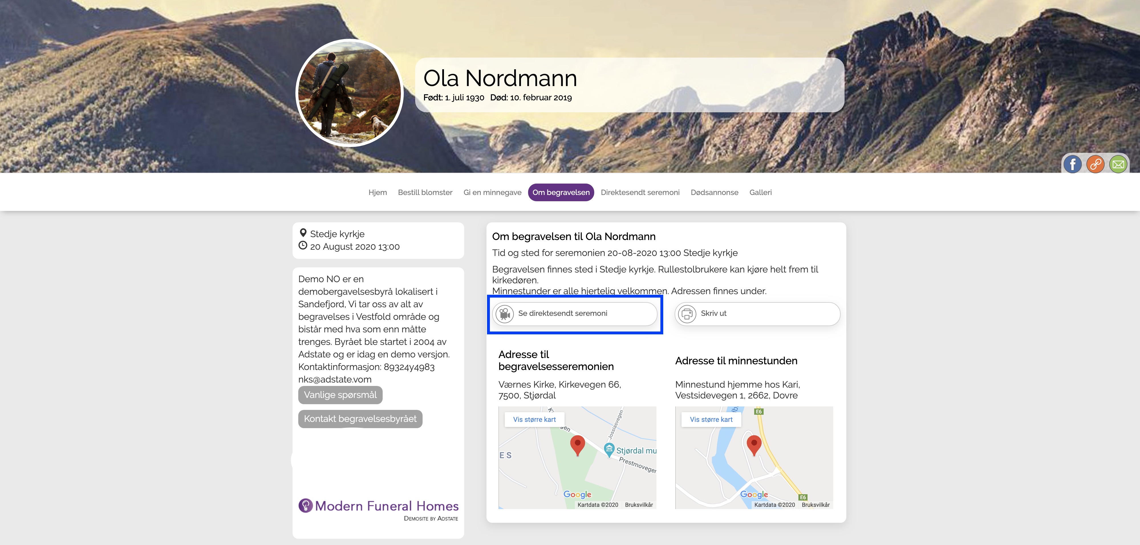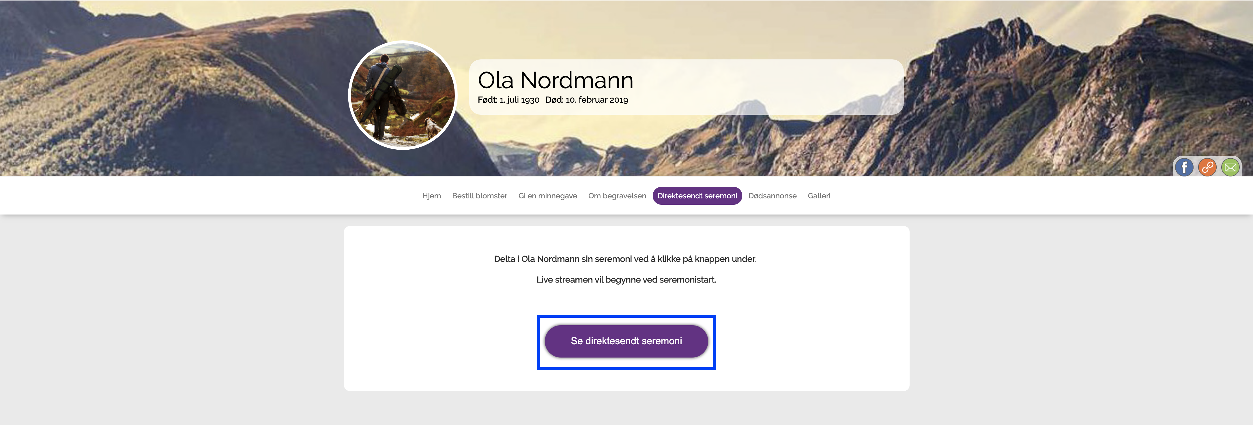 I tillegg vil en knapp for Se direktesendt seremoni være tilgjengelig fra siden Om begravelsen.