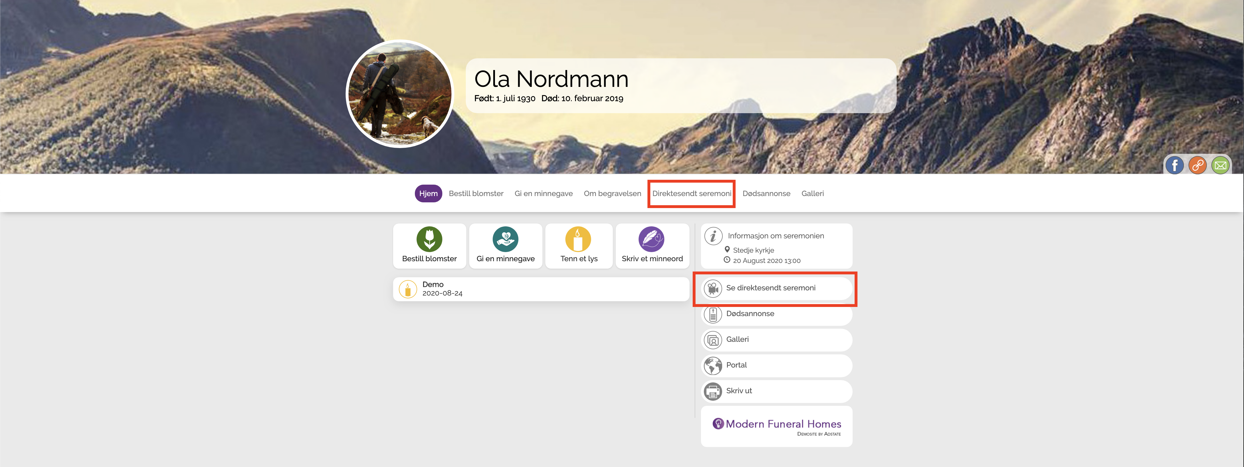 4. Når funksjonen er aktiv vil Direktesendt seremoni fremkomme i hovedmenyen på minnesiden samt knapp for Se direktesendt seremoni på høyre side.